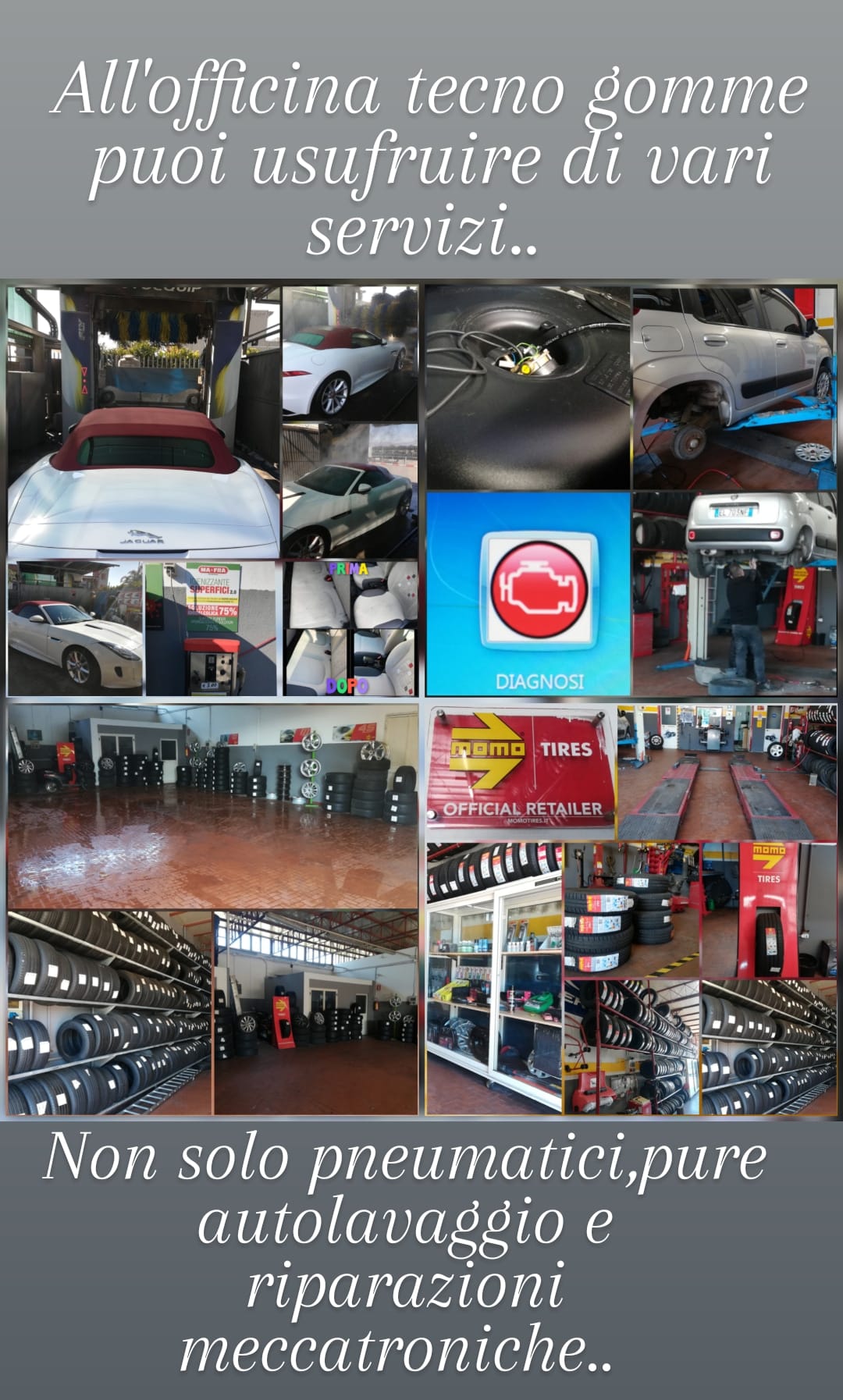 Oltre a un team di gommisti qualificati, da Tecnogomme Car service potrai richiedere il lavaggio degli esterni e l’igienizzazione degli interni, assistenza meccanica e l’installazione / ricarica di A/C Se poi cerchi dei pneumatici MOMO